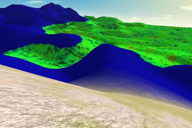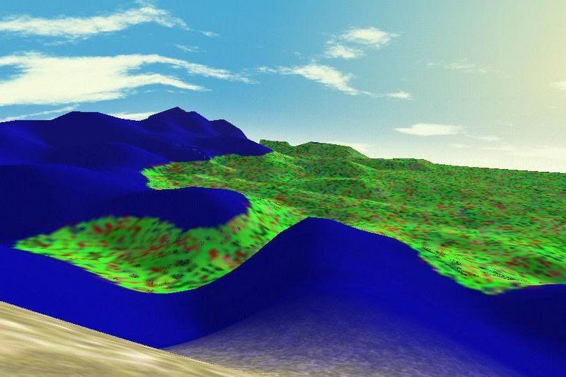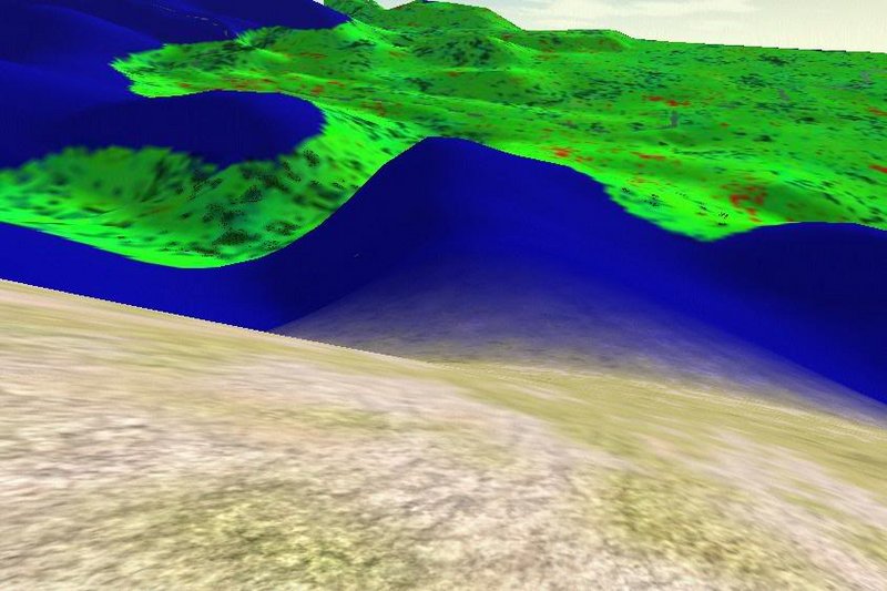 The place to start when adding noise to texture distribution is the standard deviation entry (last column in Figure 7, box 9). As long as this remains 0, you can do what you like but the terrain will remain homogeneous "long_grass". Figure 8 shows the result when we set this value to 0.5. The effect of further increasing the standard deviation (to 1.5) is shown in Figure 9.