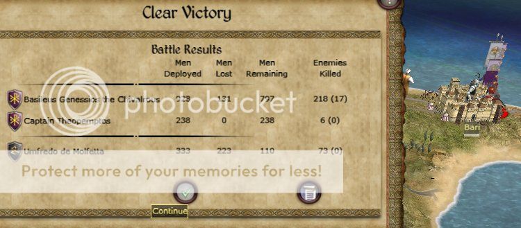 Basileus Invicta: I see. This is a war, we can't win on the battlefield. We must win it on the diplomacy's tabe. You need to reach Venice as fast as you can, and use their intermediation to reach a peace agreement that could possibly satisfy all the parties. In the meanwhile I'll capture the Bari and waiting you here your answer.