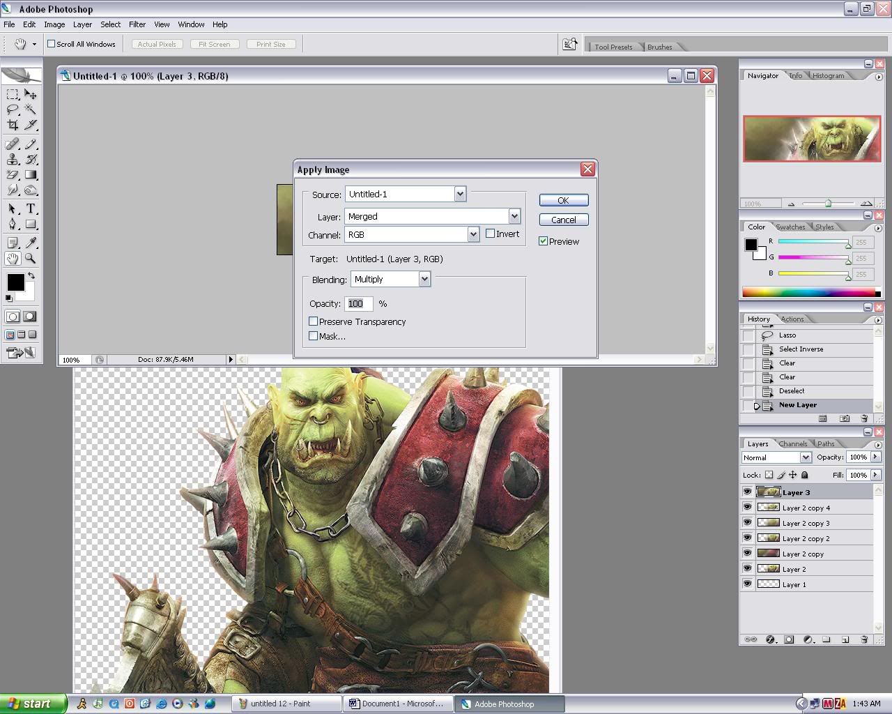 15. deselect it and go to layer and select new layer… then go to image then apply image…