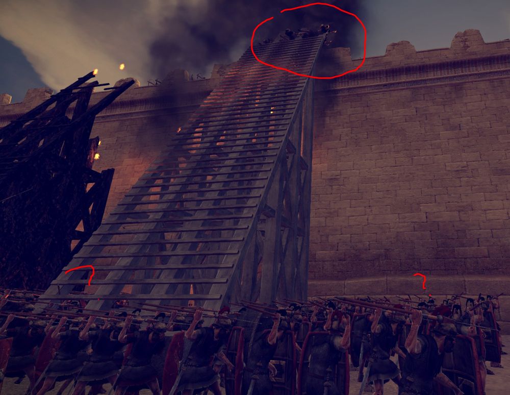 The ram made it to the gate but then did nothing. The men seemed to abandon it when they took too much fire and then just sat there until they were routed. The ladders both made it to the walls but one burned down and the men never made it up. Of the other ladder, the first few up top were all killed and then the rest of the unit stayed below for about 4 minutes.
