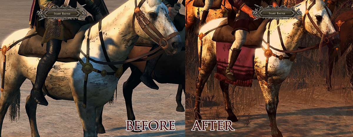 This mod will gonna give better skins for animals. Such like horses, elephants, dogs and camels. At first, I will take a look on animal skins first before I will go to other parts like armors.