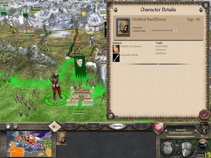 Okay, so I decided to ditch my Turkish game as all I was doing was getting into small skirmishes with the weak Byzantine army. I was owning them, anyway. Back to topic. So i started a Danish game and I recruited my first assassin and my first spy and decided to wreak havoc on Europe. I sent them on numerous sabatoge missions together, all I might add, on my own Allies so they have to use and spend more money on repairs and less on troops and expansion. I succeeded many times, but there were a few close calls. I also decided to assassinate many faction leaders and generals, again, many times they succeeded, many times they failed.
