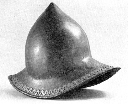 which was popular in the Spanish Army, but it is a mid-late 16th century design, and out of the timeframe of the mod. The most similar thing to it for the 15th century is this cabasset of which we do have a model for and it appears pretty regularly in Spanish units. The cabasset is considered a precursor to and early version of the Morion-style helm.