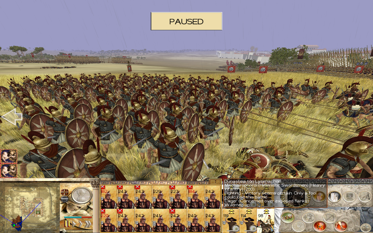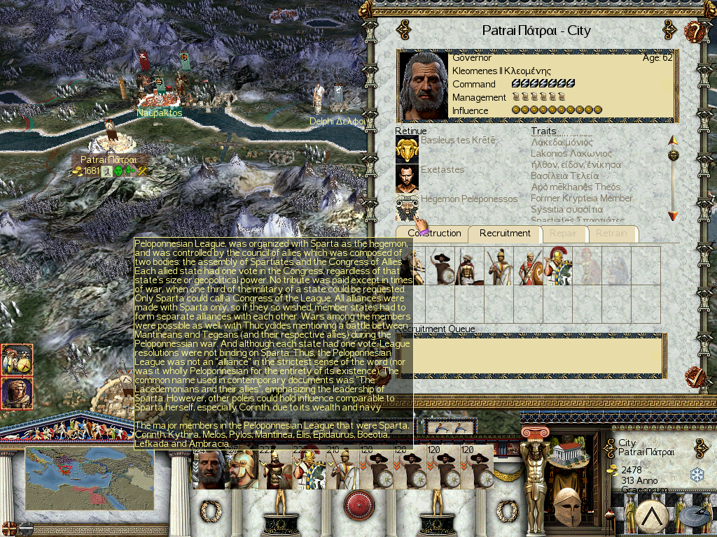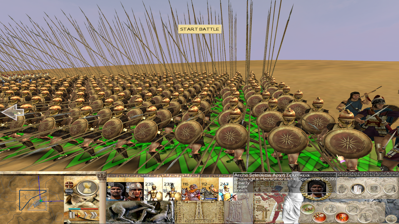 for rome different type of later legionaries, for hellenistic veteran phalanx-cavalry or thracian settlers, for seleucids indian war elephants or leopard warriors, for ptolemai african beasts, nubian axe warriors, for epeiros and lysimachos hellenised thracian-celtic soldiers, for sparta you will gain access to tarentine cavalry and hoplitai in capital regions