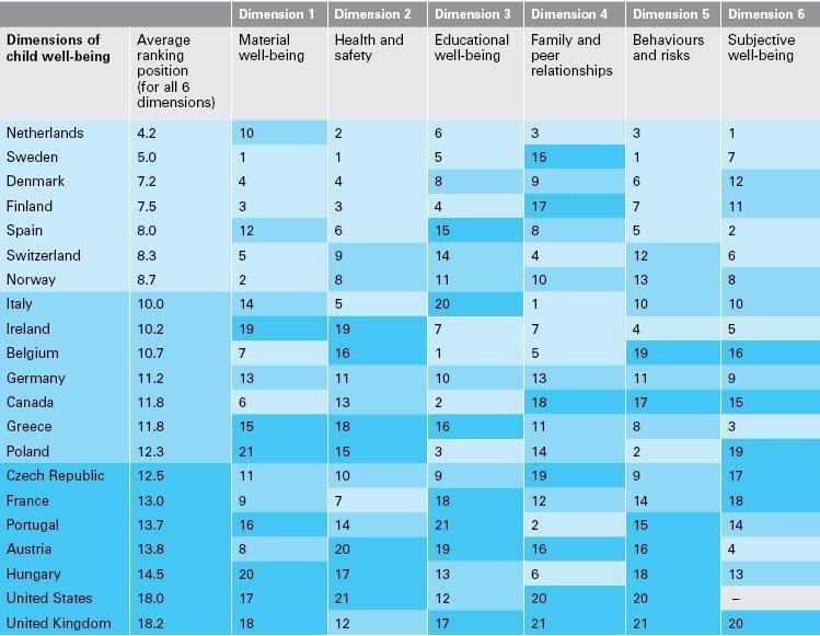This was reported on yesterday; UNICEF studied the welfare of children in industrialized nations and ranked them. The US and UK faired the worst, while countries like the Czech Republic faired better.