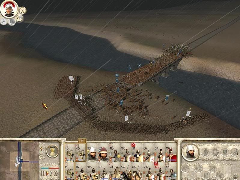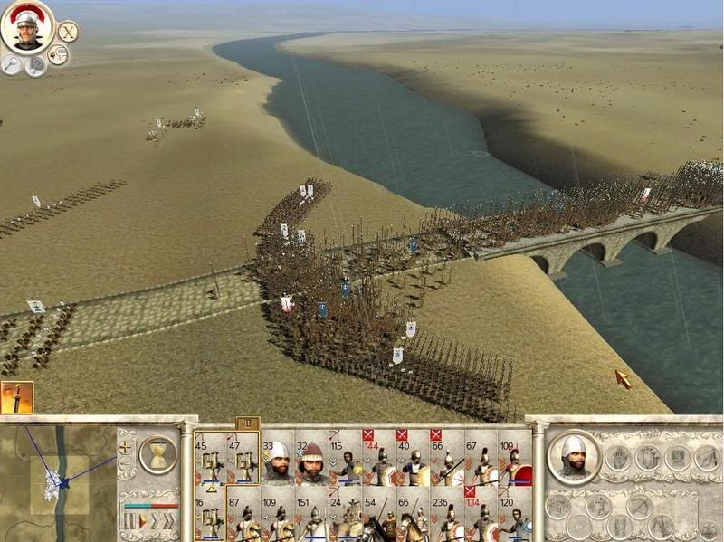 i know this picture looks normal, but the battle literally stays like this for 5 min., as most of the enemy units are seemingly "stuck" on the bridge, while the few that got to my side never seems to really engage in any fighting. The game then gets extremely laggy, and stays this way until my scorpions finally scare them into routing (or if im out of ammo they just eventually run away themselves).