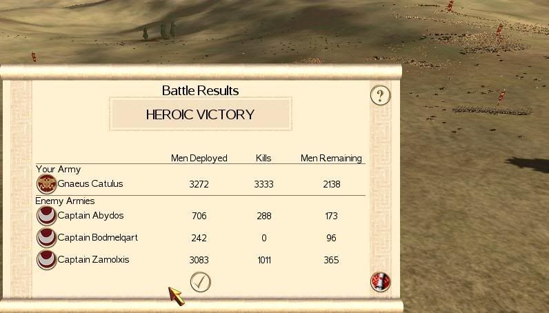 The Carthaginian Hordes clashed with the Hastatii front line slowly forced them back, the Principles moved forward and re enforced the front line. After hours of hard fighting the Carthaginian line broke giving a large gap for the Roman cohorts to flank the remaining troops, slaughtering them in their thousands.