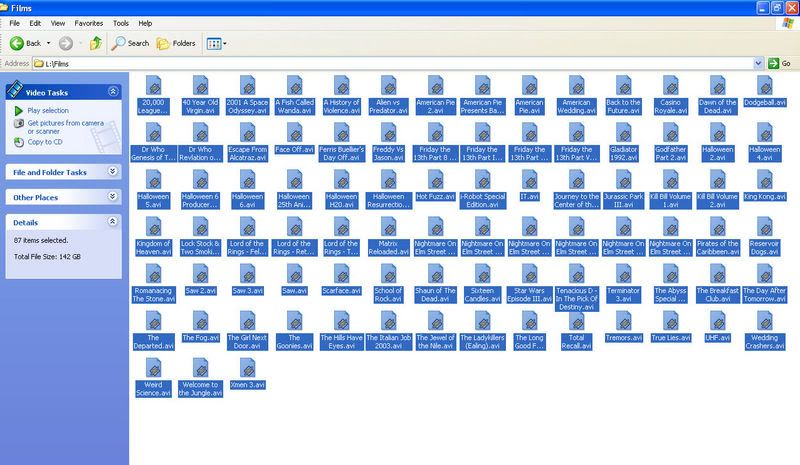 To do the conversion I’m using DVD Decrypter and AUTO Guardian Knot to do the conversion. I’ve set the conversion at 79% quality which means I lost a 21% drop in quality but movies are only a 25% the size of a DVD (roughly speaking). After that they all copied over to my external 160 gig hard drive (n: Crossfire in the picture) which is rapidly filling up. At some point I will need to get a new external hard drive (yet more money i'll have to spend) to cope with all my DVD’s (500 to 750 gig should do the trick) as I still have another 30 movies to encode on top of the 17 I’ve already done. I would hate to say how long this is going to take, maybe another month.